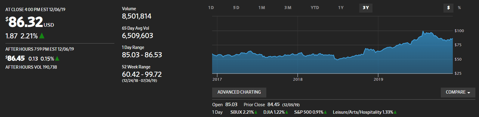 As far as whether or not I would like to invest in Starbucks, I have a mixed response to this question. Yes, the stock is at the top of its performance right now. There was a slight dip over the past three months, but it appears to be on an upward trend again. However, I am curious as to whether or not the corporation will do a stock split in the near future, and it would be easier to invest once they perform this split. Additionally, the last dividend was about $0.41 USD, which seems really low for such a large company. Therefore, I would want to wait a little bit before investing in Starbucks, but I would definitely like to invest in Starbucks in the near future.
